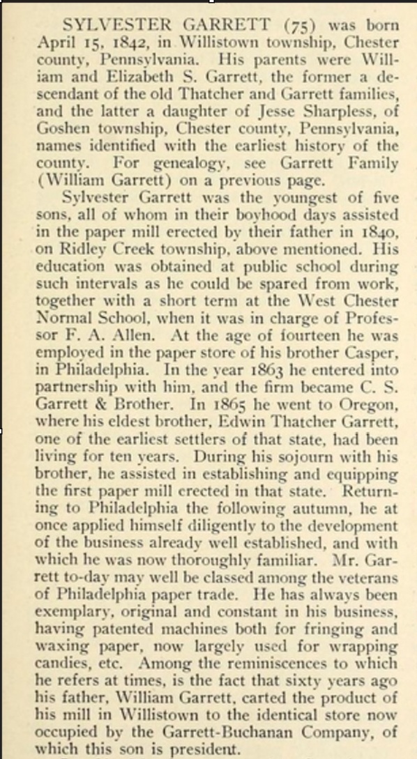 Sylvester Garrett was in the paper business for seventeen years with his three brothers at 9 South Front Street in Philadelphia before 1873, when he became one of the founders of the firm of Garrett-Buchanan Co. He was active in this large paper firm until his retirement in 1906