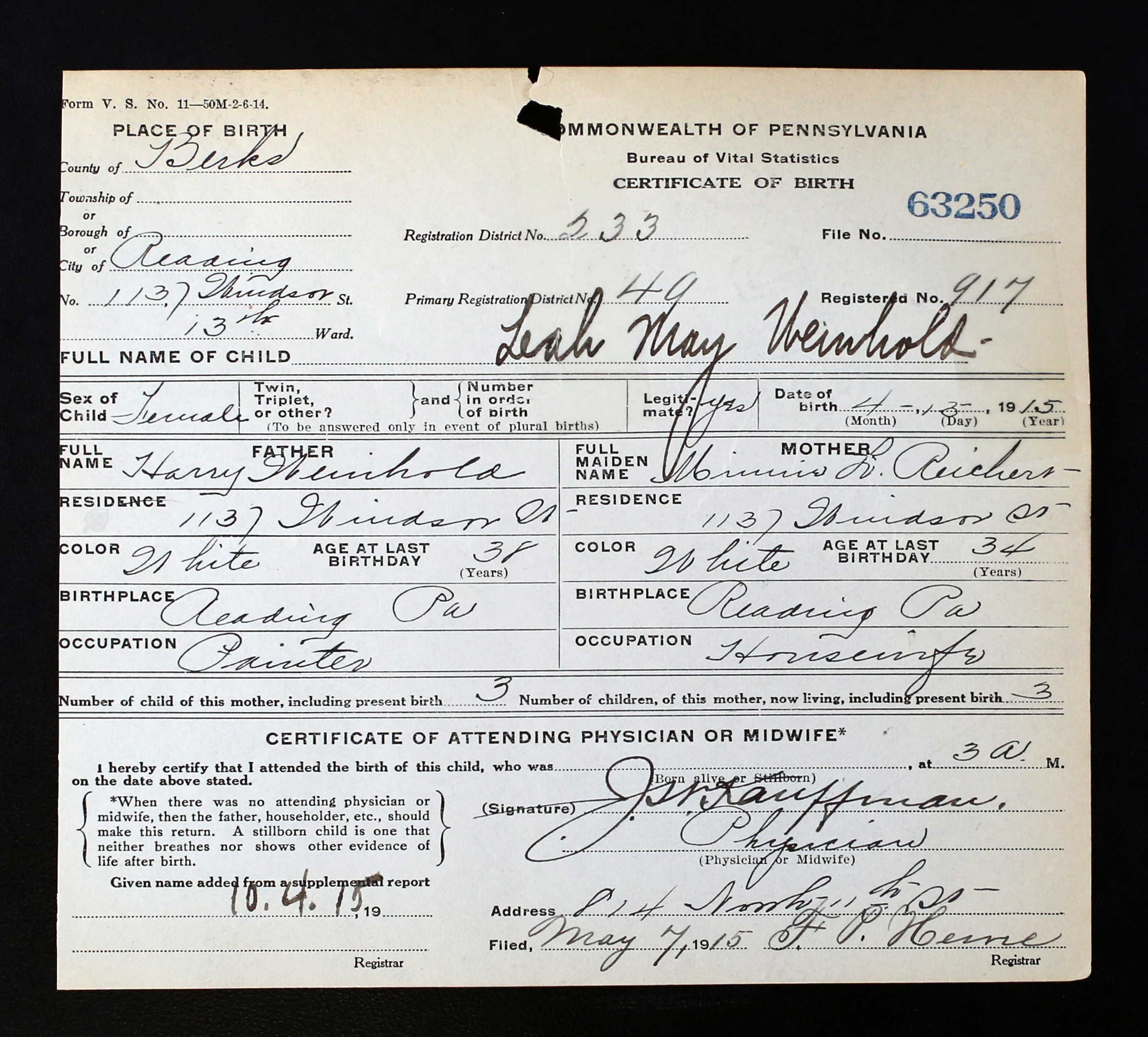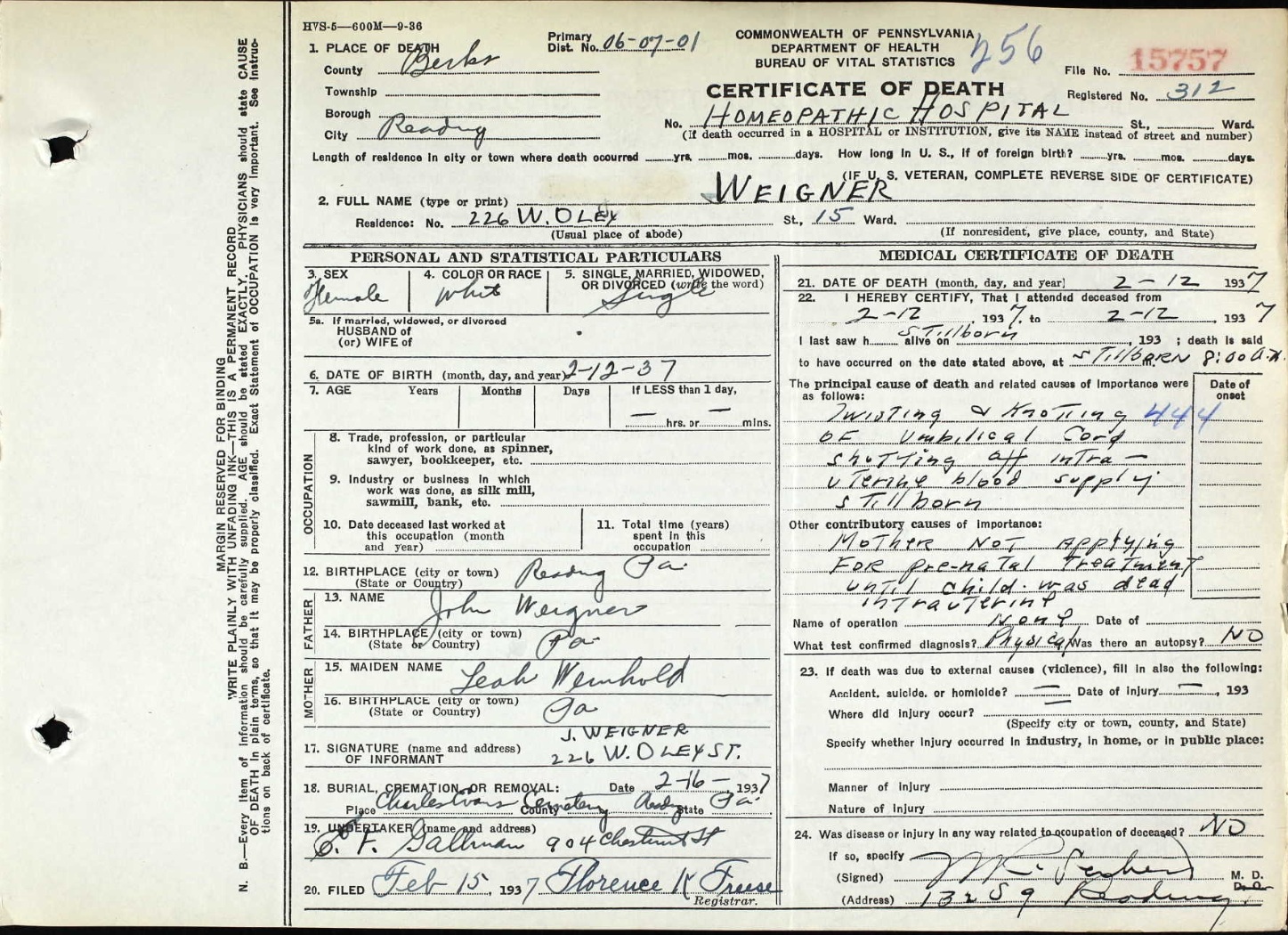 Wiegner Baby Death Certificate